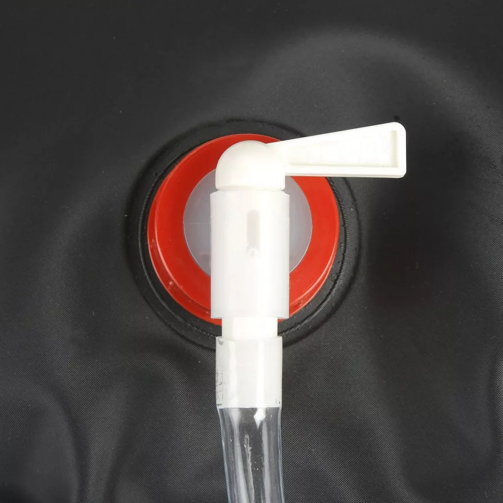 Solardusche ideal für Sommercamping. Fassungsvermögen: 20 L. Das darin enthaltene Wasser kann sich bei direkter Sonneneinstrahlung in 3 Stunden auf 48°C erhitzen.