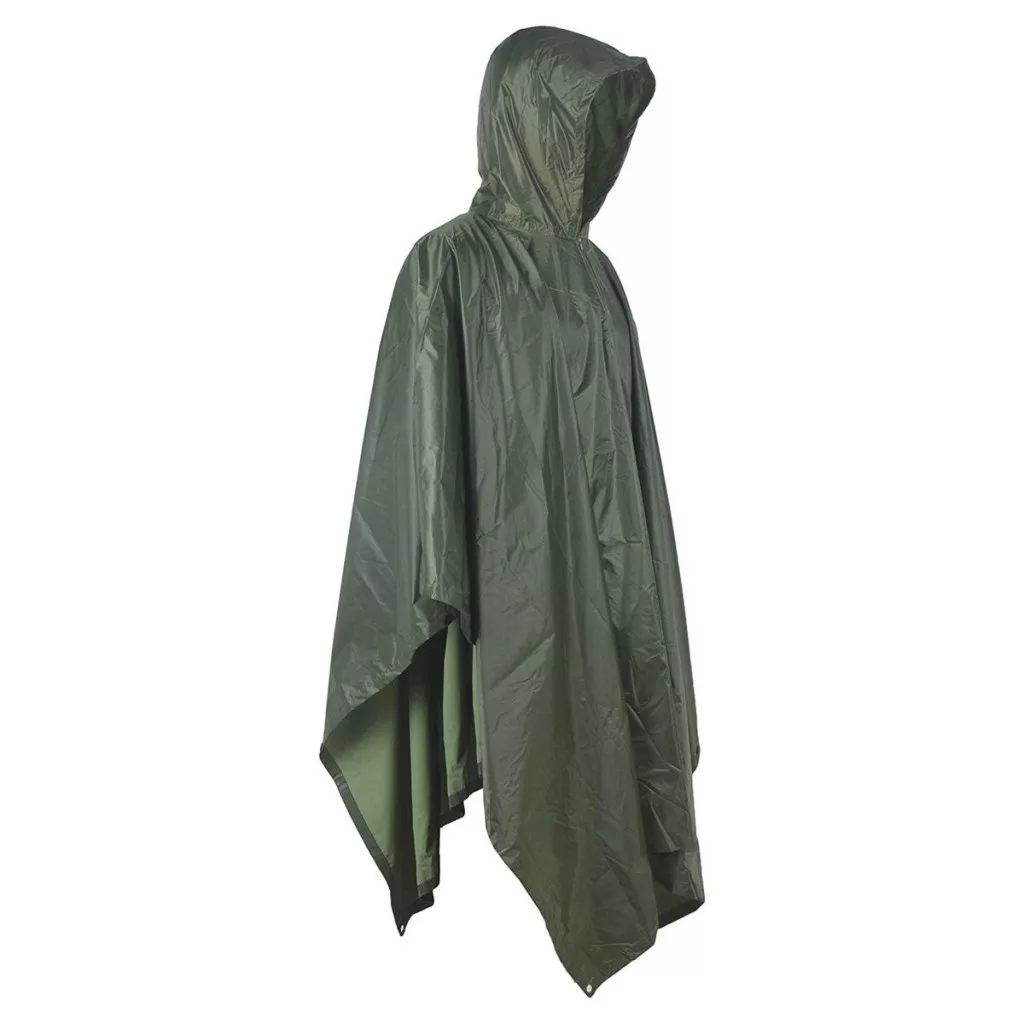 Green poncho with a retractable hood, snap closure on both sides, fully wind and waterproof MTramp rain poncho made of durable polyester. This material is lightweight, durable and waterproof, making it ideal for rain protection. The poncho jacket comes in a practical zippered case, which makes it easy to store and transport. Such a summer poncho is often used during hiking, camping, fishing and other outdoor activities, as it effectively protects against rain and wind.