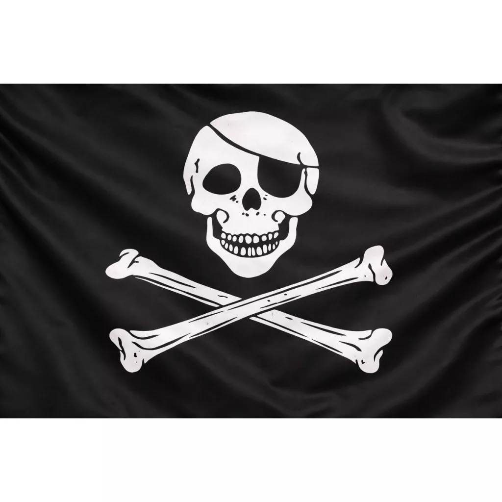 100% poliészter alapanyagú, kb. 90x150 cm méretű, karabínerrel felfűzhető félszemű koponyás lobogó.
