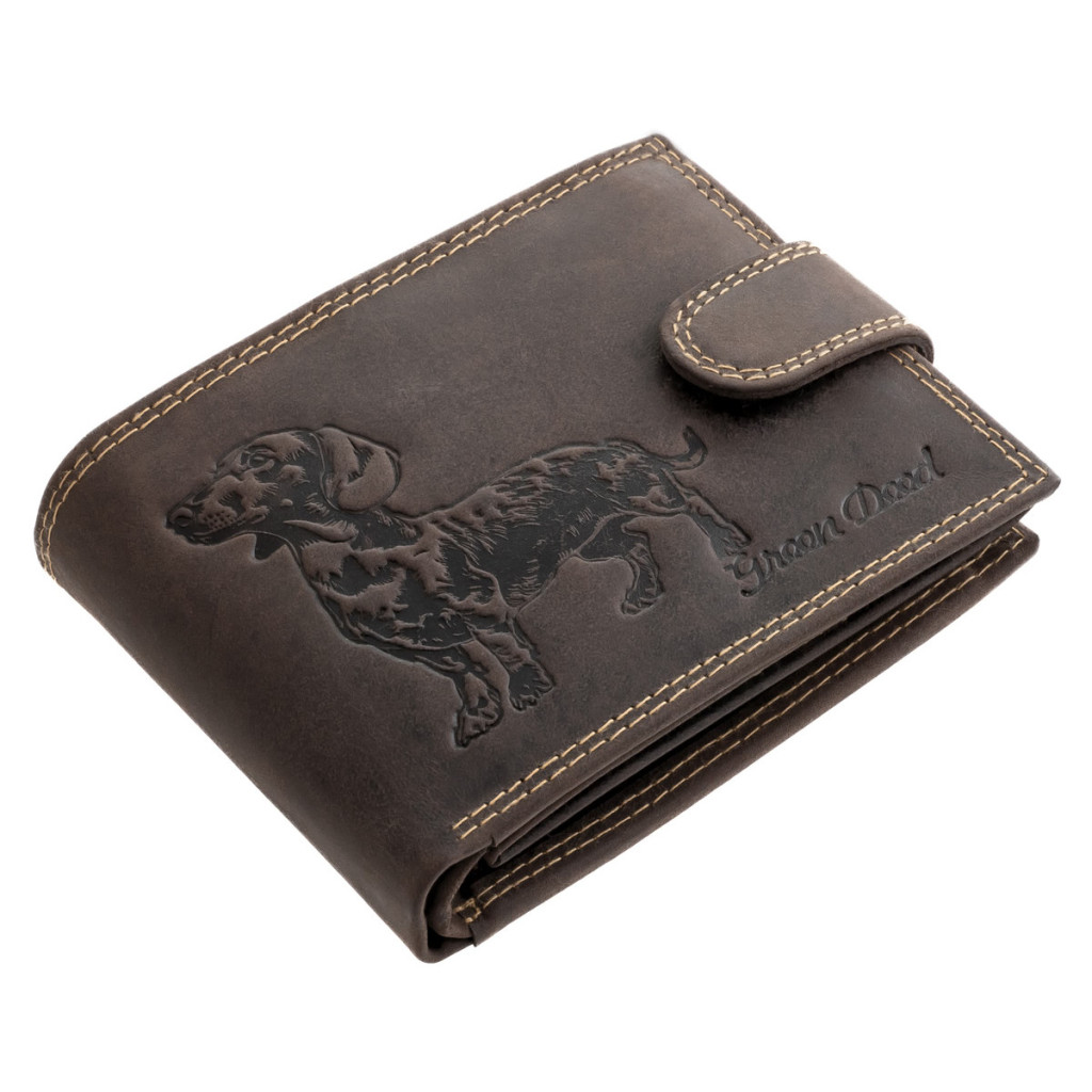 Rusztikus, valódi bőrből gyártott férfi pénztárca, mely tacskót ábrázoló minőségi benyomással készült. A mintát szépen kiemeli a világosabb színű dísztűzés, mely a tárca fedelén és a patentos pántján is körbefut.