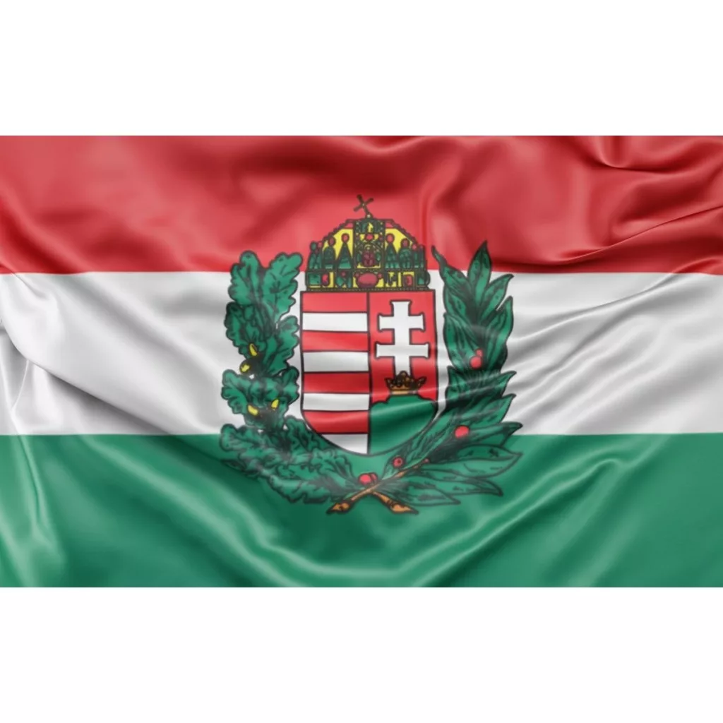 100% poliészter alapanyagú, kb. 90x150 cm méretű, karabínerrel felfűzhető magyar olajágas címeres lobogó.