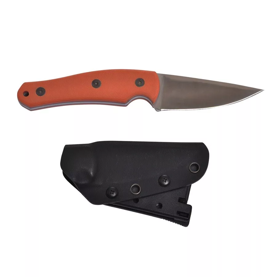 Ideális mindenes erdőjáró kés, narancsszínű G10 anyagú markolata ellenálló, rövid lándzsahegy jellegű pengéje könnyen irányítható. Önszorítós kydex tokjához az állítható dőlésű övpanel tartozék, a penge anyaga 3CR14 rozsdamentes acél.